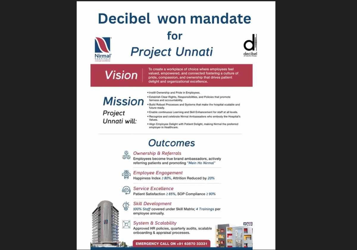 The Unnati project reflects Nirmal Hospitals’ future-driven mindset and commitment to elevating organizational excellence. For Decibel Consulting, this mandate further strengthens its reputation for executing complex, people-centric transformation projects across sectors, including healthcare.